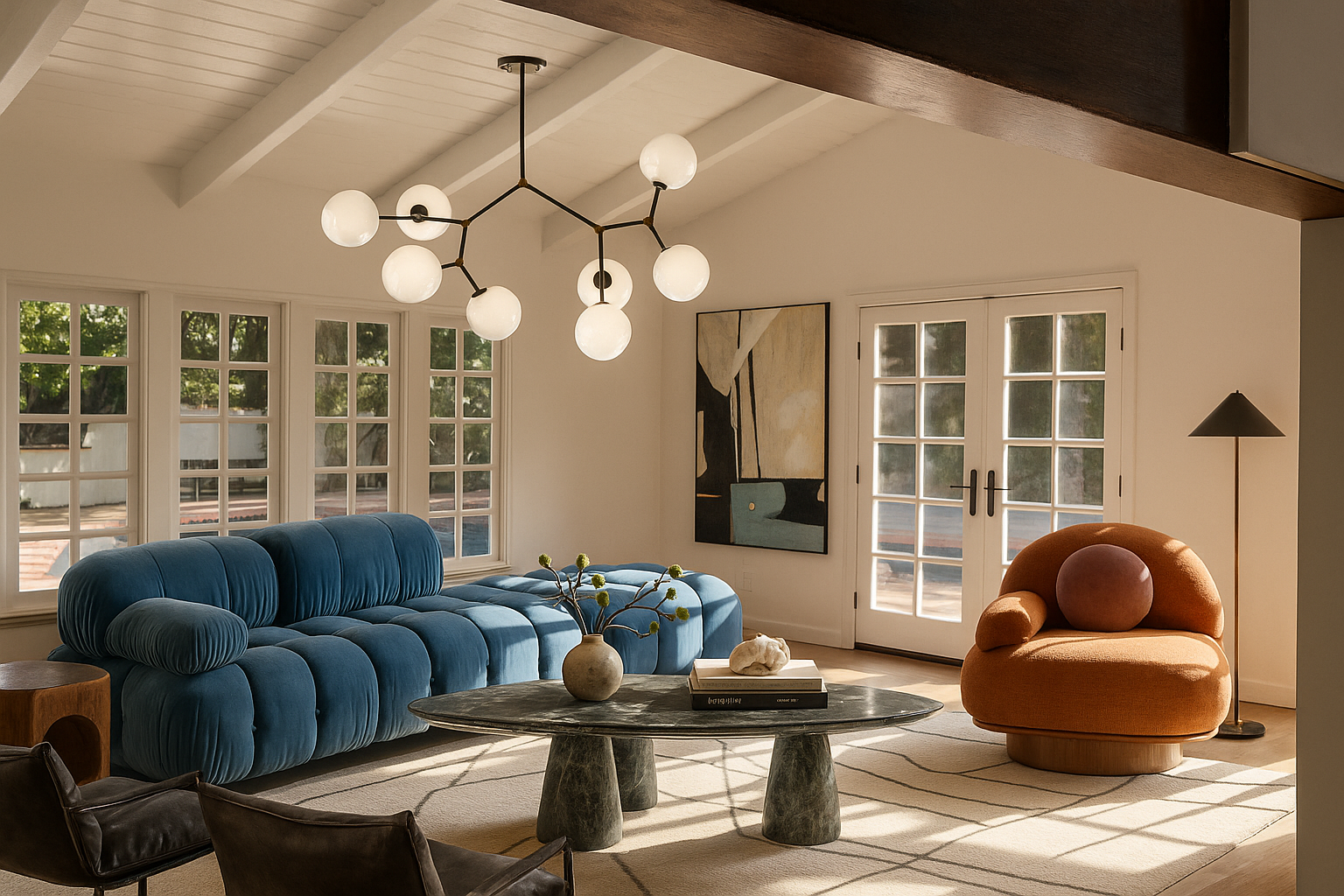 This modern Brentwood residence embodies a fresh, sophisticated approach to contemporary living. Each room tells its own story, reflecting a unique character while maintaining a cohesive modern aesthetic throughout the home. The design embraces a Modern Eclectic style, blending clean architectural lines with playful sculptural furniture and unexpected details.