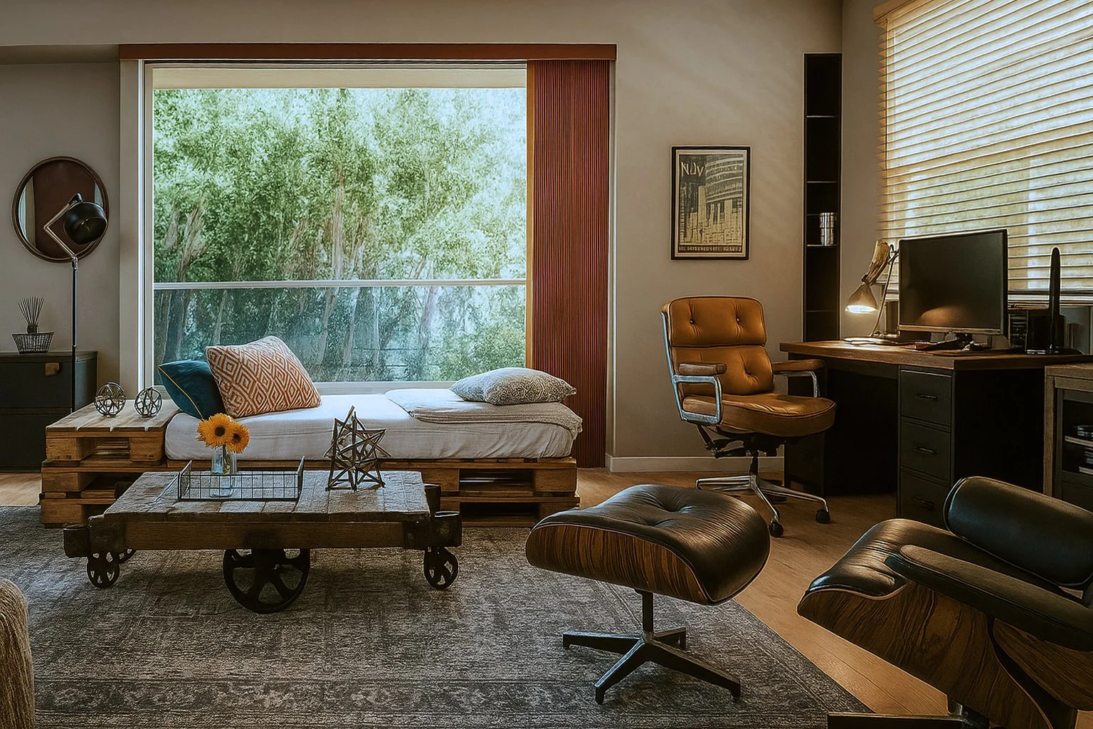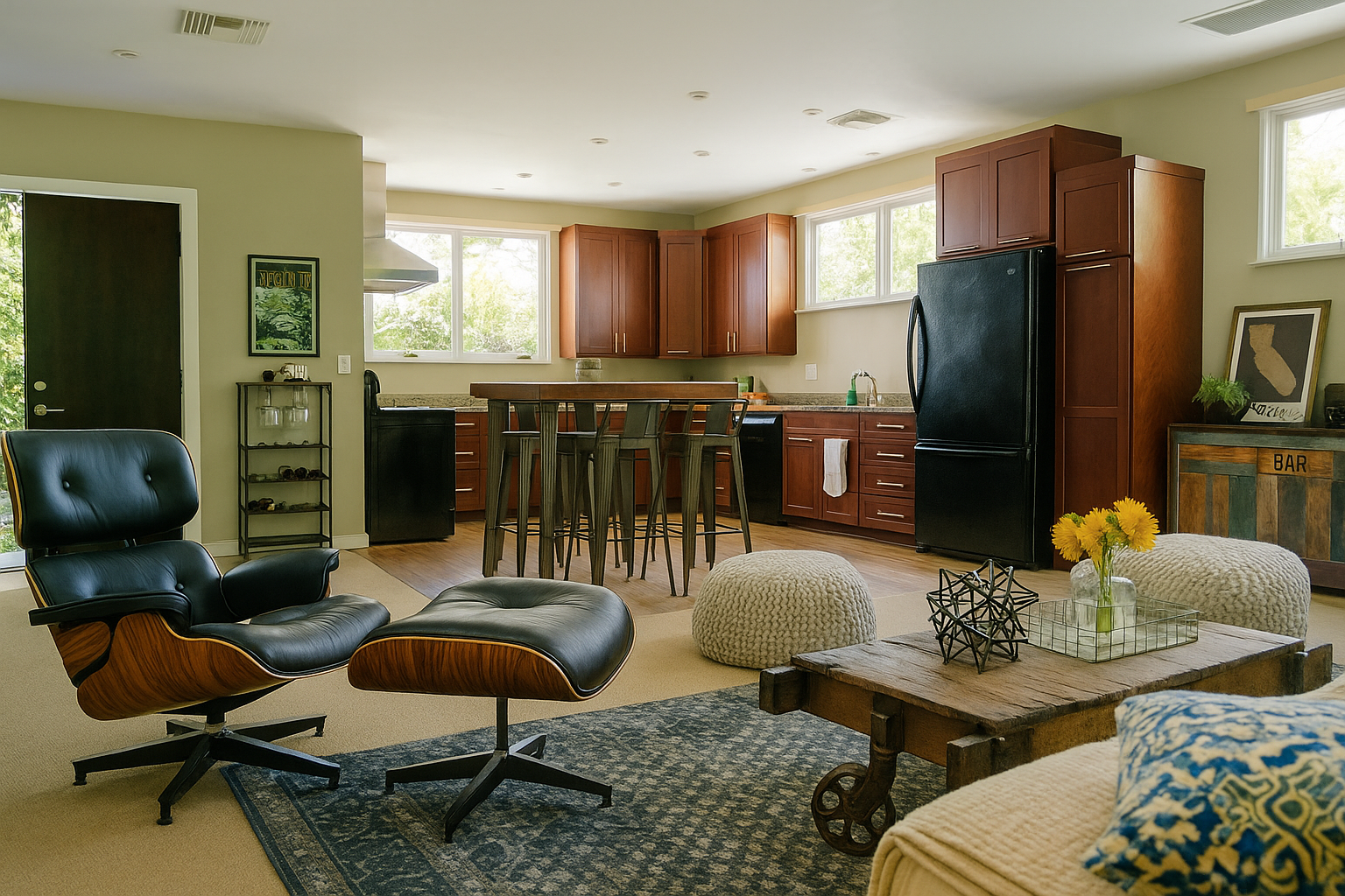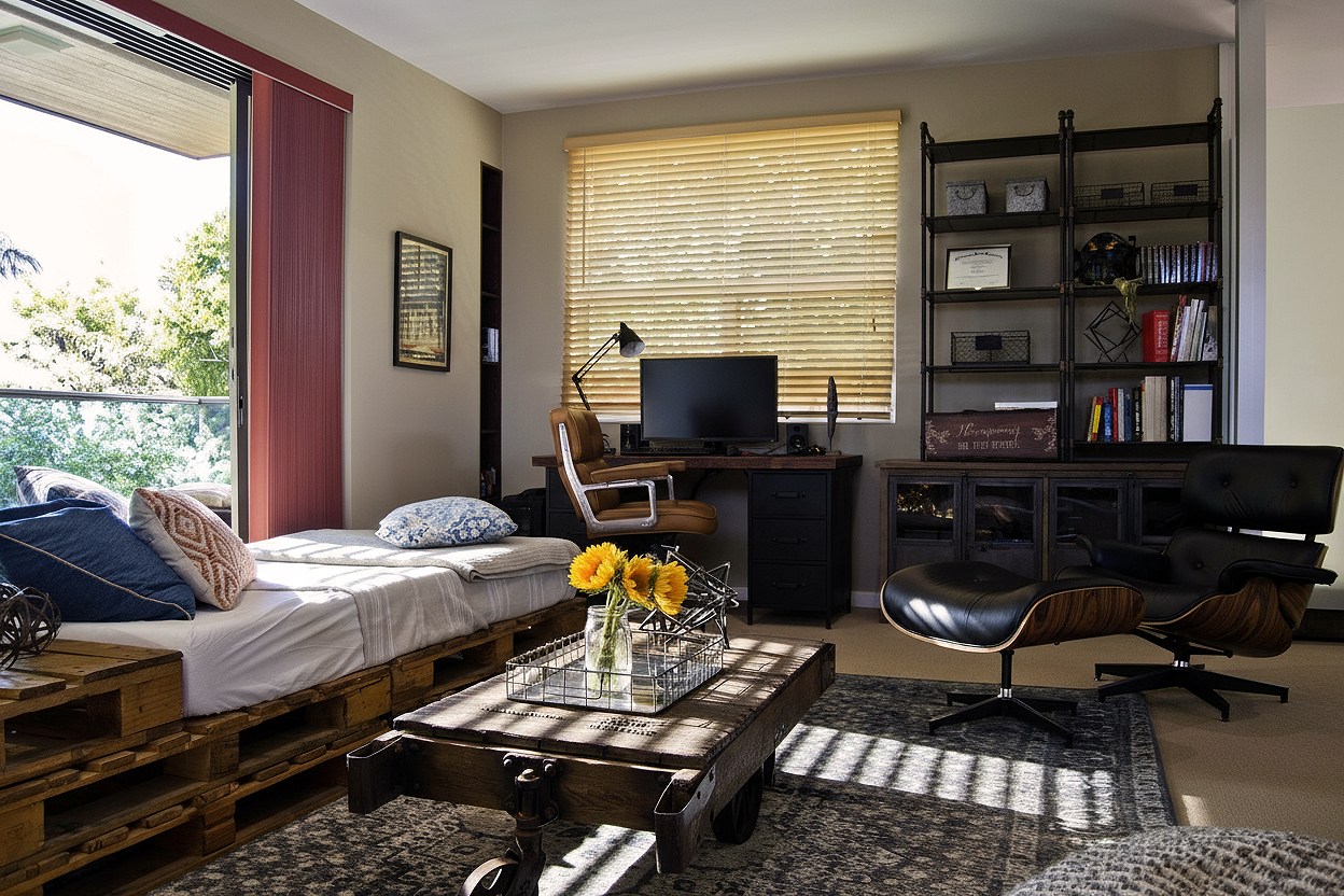 A Venice Industrial Style home blends raw, organic materials with vintage charm, featuring exposed brick, reclaimed wood, and weathered metals for a warm yet edgy feel. Custom made furniture mixes wood crates, metal pipes, and rustic details combined with vintage accesoriees, creating a lived-in, artistic atmosphere.